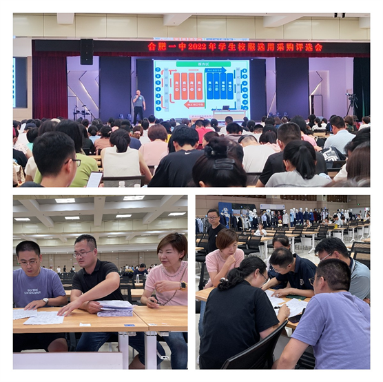 2022年8月7日上午8点30分,炎炎酷暑,合肥一中校服招标选用会于体育馆一楼学术报告厅举行。校党委委员、副校长张大勇出席大会并讲话。高一年级部主任诸敏,高二年级部主任孔华,高三年级部主任张春,滨湖校区高一年级部副主任白云波、姚恺峰,瑶海校区高一年级部副主任尚启亮,高二年级部副主任徐明星、张典俊,高三年级部副主任吴福军、汪结义,教师代表,学生及家长代表共300多人出席,招标会由政教处主任张震主持。