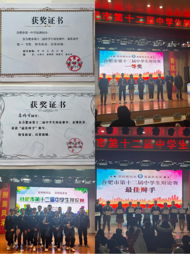 合肥市第十二届中学生辩论比赛中,合肥一中代表队荣获合肥市高中组一等奖,秦稀闻同学荣获本场最佳辩手。乘风破浪,穿花寻路,踏平坎壈逐长梦,虽远弗届;百廿合一,天下抱负,未来主人,勇立潮头临星汉,歌以咏志。