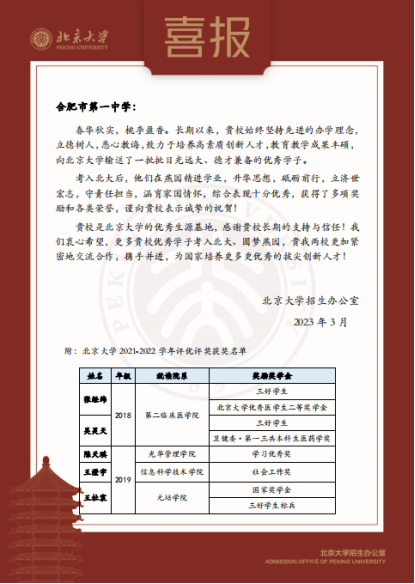 近日,合肥一中收到来自北京大学的喜报。在喜报中,北京大学对合一学子的在校表现不吝溢美之词,称赞合一学子考入北大后,他们精进学业,升华思想,砥砺前行,立济世宏志,守责任担当,涵育家国情怀,综合表现十分优秀,获得了多项奖励和各类荣誉。同时,也对合肥一中给予他们成长的辛勤培育表示感谢,并对他们的获奖表示祝贺!