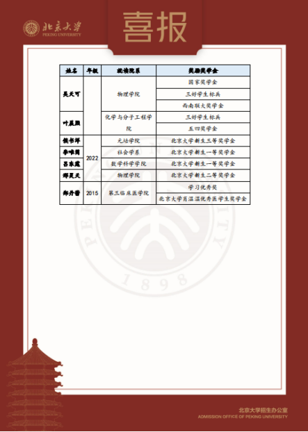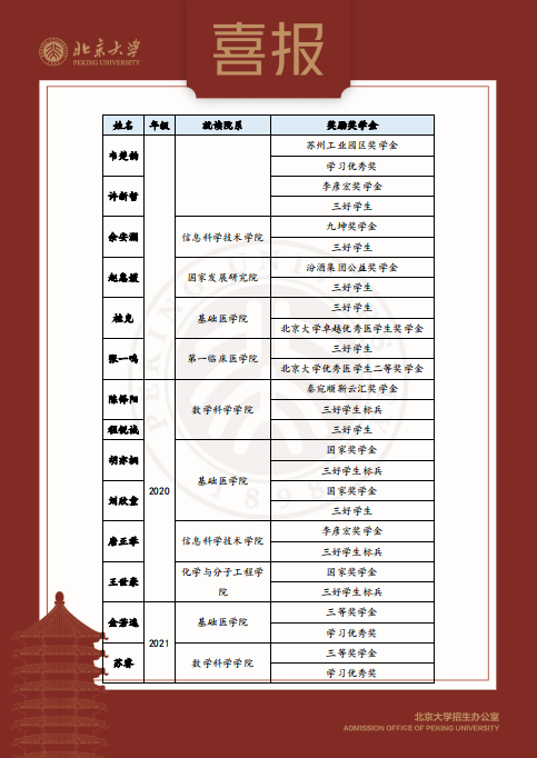 在这份喜报上,合肥一中毕业生拿到的奖项都含金量十足,涵盖了北京大学优秀医学生二等奖学金、秦宛顺靳云汇奖学金、三好学生标兵、三好学生、国家奖学金、李彦宏奖学金等。
