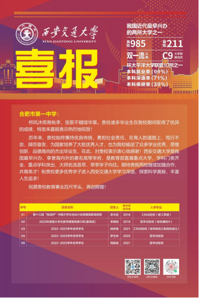 在喜报中,西安交大对合肥一中多年来始终秉持优良传统,勇担社会责任,在育人的道路上笃行不怠、踔厉奋发,为国家培养了大批优秀人才给予高度评价;对众多学业优秀、思维创新、品德高尚的合一学子交口称赞,并期待两校继续加强合作,将来有更多优秀的合一学子进入西安交大学习深造,探索科学奥秘,丰富人生追求!