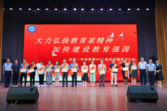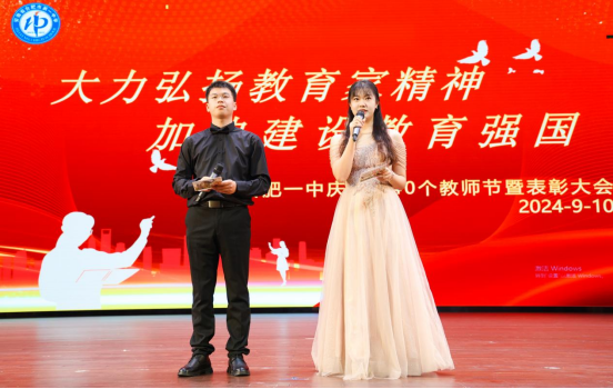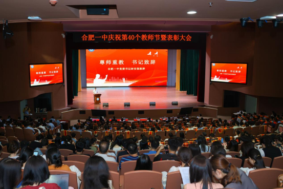 2024年9月10日下午4:30,合肥一中庆祝第40个教师节暨表彰大会在学校端馥堂隆重举行。合肥一中党委书记封安保,党委副书记、校长吴英明,党委委员、副校长张大勇、尤光雷及全体教职工欢聚一堂,共同庆祝自己的节日。本次大会由包鹏宇、张叶蕾两位老师担任主持。