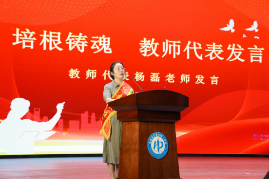 教师代表杨磊老师表示,作为教师,我们受人尊重,得到拥护,桃李满天下,同时,我们的责任重于泰山,国运兴衰系与教育。在发言中,杨老师还对教师这份职业进行反思,但同时表示无论遇到多大的困难,只要葆有爱心、初心和静心,就一定能在学生的成长中品味出师者最醇美的芬芳……