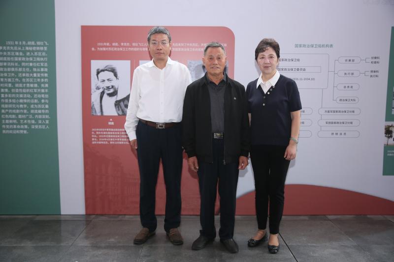 封安保书记、吴英明校长与胡底校友亲属胡茂琼在展板前合影