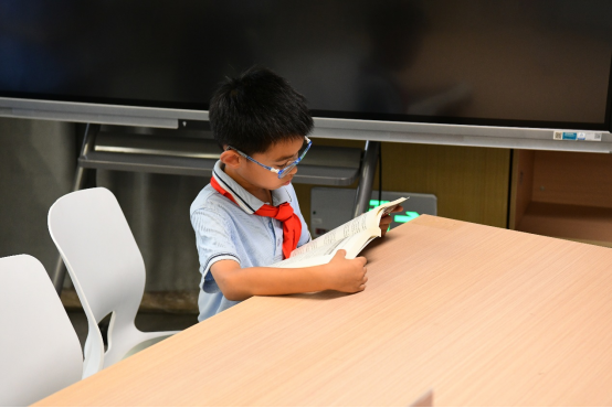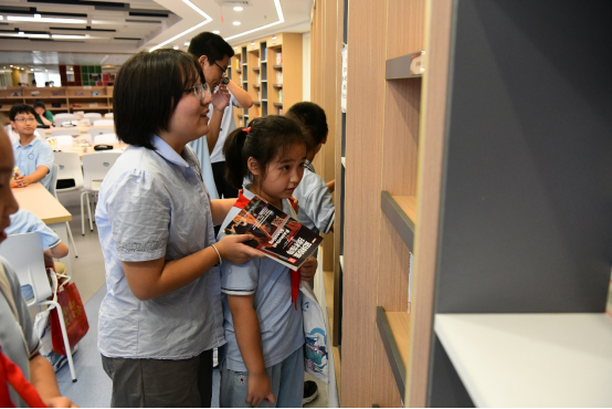 随后的校园游览与图书馆体验环节,志愿者们围绕“科技与成长”展开讲解:在高一至高三年级部一楼区域,介绍课堂中的科创实践活动;在图书馆内,推荐科普类书籍,分享科学阅读方法,让“科技领航”的理念延伸至日常学习场景。