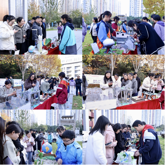 活动期间,合肥市第一中学南广场(端馥堂西侧)同步举办了学生地理实践成果展示。合肥一中、合肥一六八中学、合肥市第四十六中学及蜀山区省级教研基地校学生代表现场展示了丰富多样的地理模型、地理调查、地图绘制等实践作品,包括地貌模型、岩石圈模型、太阳系模型、客家土楼模型、安徽省地形图模型、中国特色地图绘制、校园地图绘制、农产品种植成果等,更直观地体现出学生运用地理知识及动手的能力。