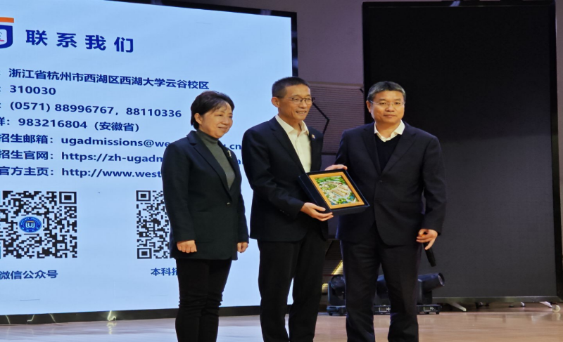 在交流环节后,施一公院士代表西湖大学向合肥一中赠送了一份特别的礼物——西湖大学校园全景图。画卷展开,湖山之间的学术建筑群与自然景观和谐共生,呈现出一幅现代大学与人文自然相融的美好图景。“这不仅是一幅画,更是一份邀请。”施院士表示,期待未来能有更多合肥一中的优秀学子在这片学术沃土上实现理想。封安保书记、吴英明校长代表学校接受了这份饱含深意的礼物。