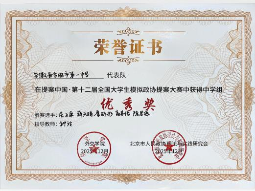 近日,全国模拟政协比赛在北京外交学院圆满落幕。由范子康、 高家怡、 詹昕彤、 薛天晴四名学子与指导老师钟玲组成的合肥市第—中学代表队, 凭借“推进合肥市儿童友好城市建设”的优质提案, 在全国顶尖学子的同台竞技中脱颖而出, 荣获优秀奖, 载誉归来!