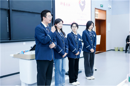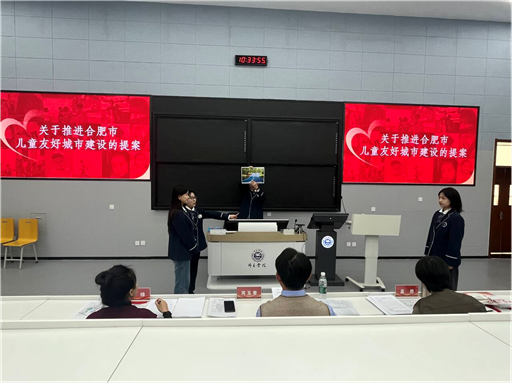 比赛现场亮点纷呈:四位同学分工明确、配合默契, 提案展示环节逻辑清晰、重点突出,将合肥儿童友好城市建设的现状与需求娓娓道来;答辩环节从容不迫、思维敏捷,面对评委的提问精准回应、条理分明,既展现了扎实的知识储备,更彰显了—中学子心系家乡、勇于担当的青春风采,传递了合肥这座城市对儿童成长的重视与关怀,赢得了评委的—致认可与好评。