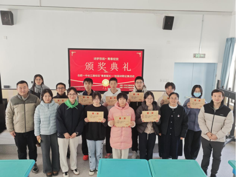 2025年12月16日上午,合肥一中长江路校区“青春赋长一”校园诗歌征集活动颁奖典礼在阶梯教室成功举行。合肥一中长江路校区高一年级部负责人周典钰、合肥一中语文学科主任王青及多位教师代表出席活动,为获奖学生颁奖,共同见证了一场属于青春与诗歌的盛会。