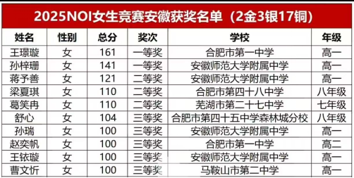 值得一提的是,在同期举办的NOI女生竞赛中,合肥一中王璟璇同学凭借扎实的专业功底和出色的临场发挥,斩获安徽省第一名的优异成绩,尽显“巾帼风采”,为学校荣誉再添新章。