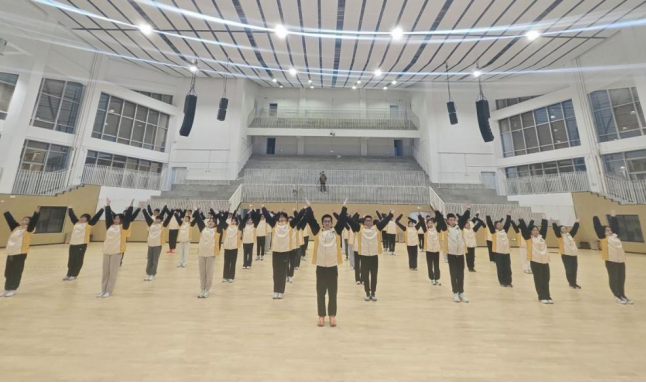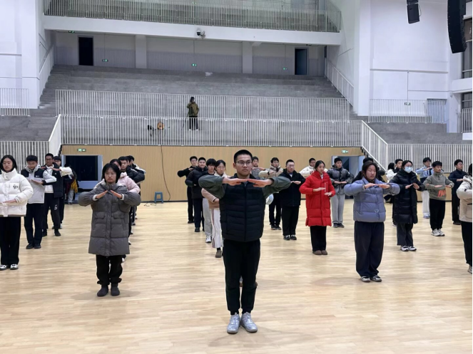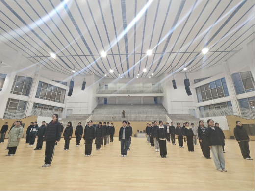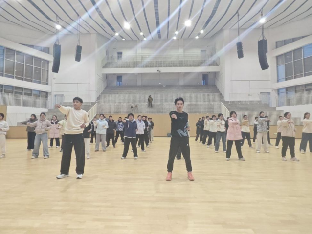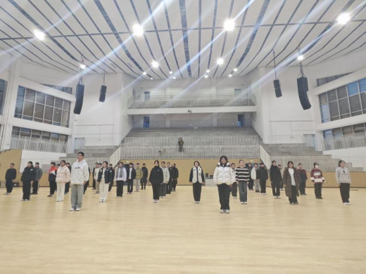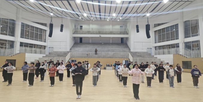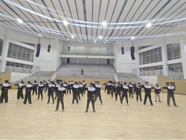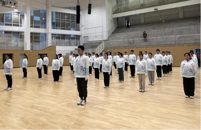 体育馆内,各代表队动作整齐划一、口号洪亮、激情四溢。各代表队身着统一赛服,精神抖擞,按序登场。随着《功夫青春》的音乐声响起,同学们起式抱拳、虚步亮掌、弓步冲拳、弹腿拍脚……一系列动作行云流水,一气呵成。冲拳带风,铿锵有力;震脚踏地,声如擂鼓;声声呐喊,汇聚成磅礴的声浪,在馆梁间激荡,充分展现了同学们训练有素的扎实功底和昂扬奋发的精气神。
