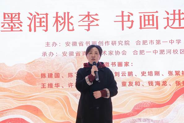 活动于下午3时正式拉开帷幕。合肥一中党委副书记、校长吴英明首先致辞,对书画家的到来表示热烈欢迎与诚挚感谢,并强调了美育在育人过程中的重要作用。学生代表分享了学习书画的心得体会,表达了在传统艺术滋养下成长的感悟。安徽省书画创作研究院陈建国院长则在发言中指出,中国书画艺术是中华民族的文化瑰宝,笔墨之间承载着深厚的文明智慧与审美情怀。他寄语师生“不积跬步,无以至千里”,并祝愿大家在新的一年里福慧双增、前程似锦。