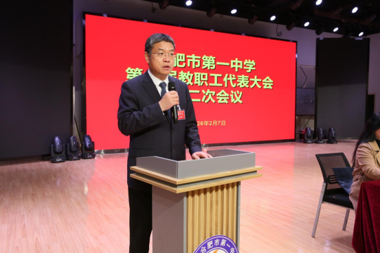 合肥一中党委副书记、校长吴英明封以《立德树人守初心 凝心聚力创未来》为题作学校工作报告。报告从党建领航、德育铸魂、教研筑基、文化浸润、强化保障、彰显特色、硕果满枝等七个方面回顾了2024—2025年学校教育教学及党建工作,报告还对学校2026年的工作给予展望。报告强调,合肥一中全体师生要时刻保持敏锐的教育触觉,及时更新教育观念和教育方法;要深入学习和研究教育教学理论,不断提高自身的专业素养和教育能力;要以更加严谨规范、严肃准确的态度,全面推进学校的高质量发展。