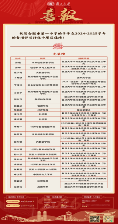 喜报中,复旦大学对合肥一中长期以来的育人理念与办学成果予以高度认可,盛赞合一学子怀揣家国情怀,在复旦的学术殿堂中勤勉钻研、勇于探索,在专业学习、实践创新等多个领域崭露锋芒,以扎实的学识功底和昂扬的精神风貌诠释了“怀天下抱负,做未来主人”的合一校训。