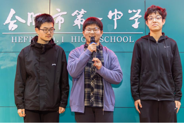 随后,五位特殊的嘉宾从观众席中起身,在学弟学妹们惊喜的目光中走向舞台中央。他们是合肥一中近年毕业的优秀学子,如今正于中科大深造:施耀炜、陈博文、吴昆泽、彭浩宇、汤少帅。五位学长专程回到母校,只为在这一刻,将他们的祝福与期许亲手传递给在场的每一位学弟学妹。
