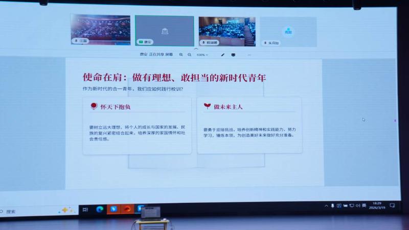 2026 年 3 月 19 日下午,合肥一中团委组织开展了本期团校第七次团课,以《怀天下抱负,做未来主人》为主题,由校长吴英明主讲,江河湖海四校区线上同步直播,入团积极分子及学生团总支成员共同参与此次学习。