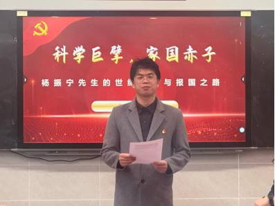 包鹏宇老师带领全体党员深入学习杨振宁先生的光辉事迹,以详实的史料为依托,全面讲述了杨振宁先生的传奇一生。从合肥沃土走出的少年学子,到跻身世界物理巨匠的学术泰斗,先生在“杨 -米尔斯规范场论”“宇称不守恒”等领域的突破性贡献,为人类认知宇宙奠定了重要基础。作为合肥一中的杰出校友,先生始终心系母校,授权创办全球唯一“杨振宁班”、录制校庆祝福视频,用实际行动诠释对故土与母校的深厚情谊。更令人动容的是,先生“宁拙毋巧,宁朴毋华”的治学态度以及“科学无国界,但科学家有祖国”的赤子情怀,让在场党员深受触动。