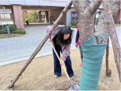 正值春季修剪关键期,“小苗修剪要讲究‘留强去弱’,保持树形通透,这和培养学生是一个道理”。学方楼内庭,党员们化身“园艺师”,手持修枝剪,小心翼翼地对花草灌木进行整形修剪。