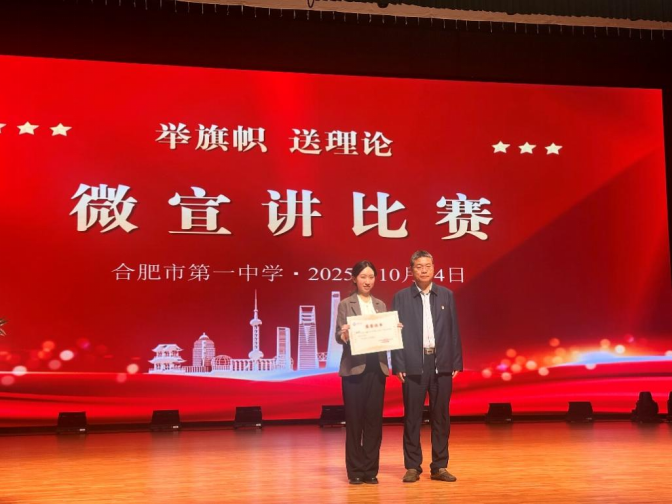 金秋十月结硕果,理论宣讲谱新篇。10月14日,在合肥一中“举旗帜 送理论”微宣讲比赛中,钱奕宇老师以《扎根时代沃土 绽放科技繁花》为主题,从历史纵深中探寻教育发展脉络,以青春之声奏响时代强音,凭借生动的历史叙事与饱满的宣讲激情,荣获校级一等奖。这份荣誉的背后,既有参赛者个人的深耕钻研,更凝结着团队协作的智慧与汗水。