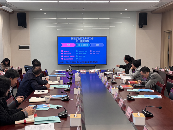 最后,封安保书记作总结强调。他表示,校园安全无小事,防范学生欺凌关乎学生成长、家庭幸福与社会稳定,全体干部要以高度的责任感与使命感,将十个 “1” 任务清单与专项行动要求抓细抓实。要坚持以人为本,注重教育引导与人文关怀,通过安全信息员队伍建设、矛盾台账动态管理等举措,及时化解学生间矛盾纠纷;要强化责任落实,层层传导压力,确保制度完善、培训到位、排查全面、处置规范,为学生营造安全、和谐、文明的成长环境。
