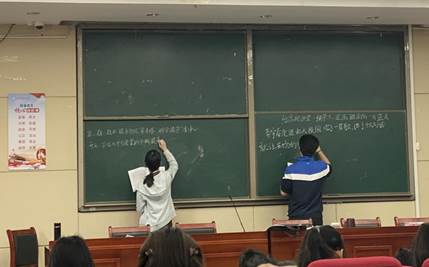 为了学以致用,胡老师专门安排了同材料异写作环节,引导大家由理论过渡到实践。在场的同学都跃跃欲试,还有两位同学登上讲台,在黑板前同台PK,一较高下。