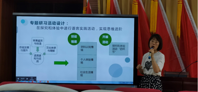 张老师强调了选择性必修是必修到选修的“过渡课程”,即既有基础性和共同性,又有提升性和发展性。指出教师在教学中要关注单元内部组织和任务要求,要整合、聚焦、关联学习材料与情境,进而在探究和体验中进行语言实践活动,实现思维进阶。