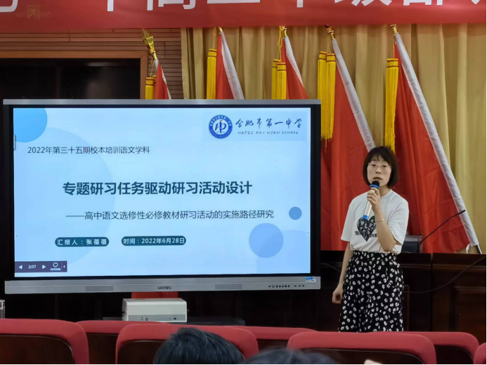 最后,合肥一中张蓓蓓老师以“专题研习任务驱动研习活动设计”为主题向老师们分享了高中语文选择性必修教材研习活动的实施路径研究。张老师从“选择性必修课程与教材的定位”“选择性必修教材的特征”“研习活动的设计”“研习评价的实施”四个方面加以分享介绍。