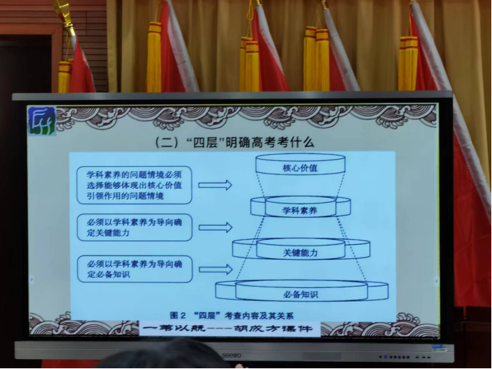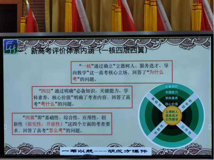 胡老师从“一核四层四翼”角度概括了新高考评价体系的内涵,高屋建瓴而又深刻精准地分析了高考 “为什么考”“考什么”以及“怎么考”的核心问题。强调了“一核”对考试选材的统领,分析了“核心素养”和“学科素养”异同,阐述了由“必备知识、关键能力、学科素养、核心价值”构成的“四层”考查内容及具体要求。