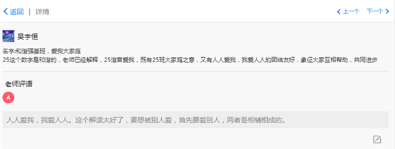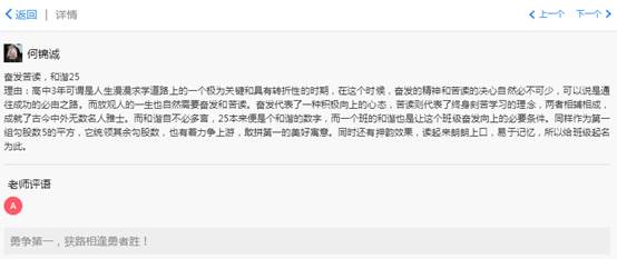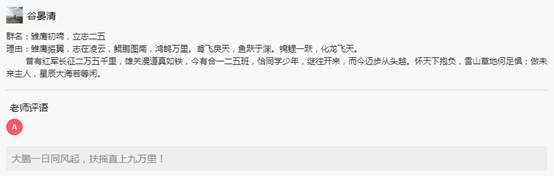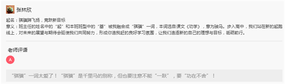 陈老师评价:"骐骥"这个词我很欣赏,首先,这个词出自荀子的《劝学》中的“骐骥一跃,不能十步;驽马十驾,功在不舍”,既有千里马奋蹄前进,一日千里的美好意蕴,更暗含唯有"功在不舍"方可行稳致远的警示与告诫。其次,"骐骥"与我名字中的"起"标强"基"谐音,也是很有意义的巧合,期待我会成为发现并挖掘千里马才能的伯乐。最后,"骐骥"的另一重谐音,则预示着,我们师生共同努力,在大合一这一片广阔的天地中纵横驰骋,谱写共同的"奇迹"与辉煌!