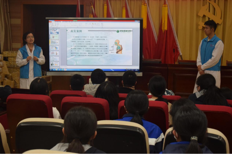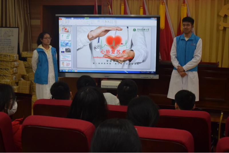 2023年3月8日,万里长空,春风伏案。为加深同学们对急救知识的理解,提高学生对突发事故的处理能力,安徽医科大学第一临床医学院志愿者服务队应程娴老师的邀请来到合肥一中滨湖校区,为高三6班的同学们带来了一场精心准备的生命课程培训讲座。