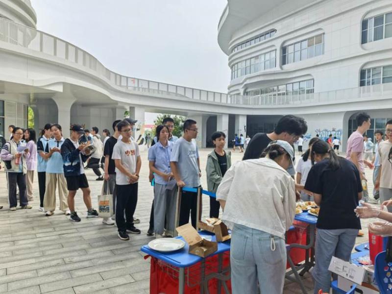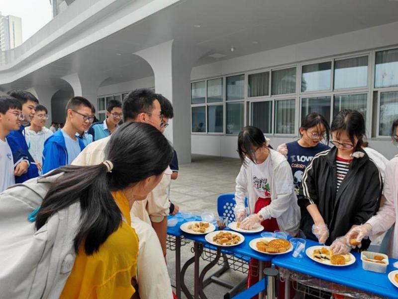 雅韵中秋,团圆“食”刻。值此佳节,美味的月饼必不可少。豆沙、枣泥、蛋黄、五仁……口味丰富的月饼被万食社摆放在食品展台上。社员们热情地分发月饼,同学们在食品站台前有序地排着队,期待尝一口酥香甜蜜的节日味道。