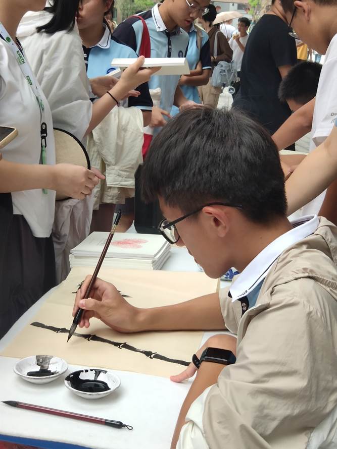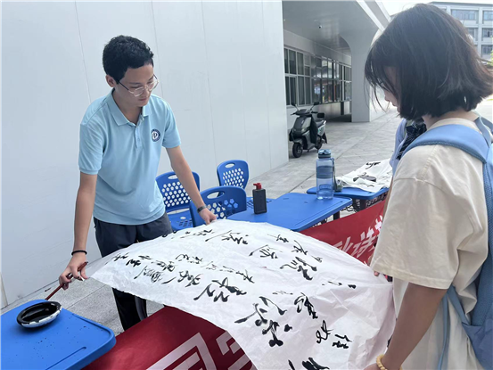 此次快闪活动分设了四个小展台,包容了现场灯谜竞猜、即兴书法创作、中秋主题诗词朗诵、学生美图欣赏、美味月饼品尝等内容。随着广播站“好时节,中秋月”的专题播音想起,此次快闪活动正式拉开帷幕。下课后的同学们纷纷涌向三叶草中庭共度中秋佳节。