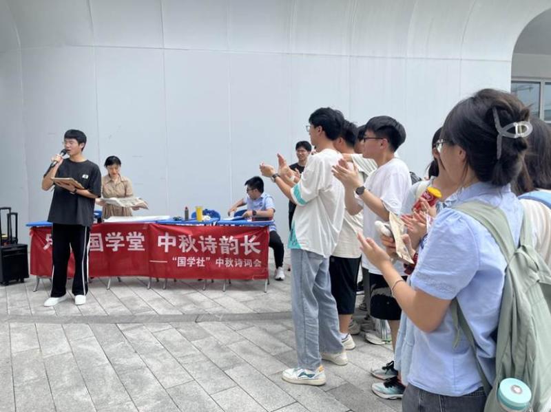 月满国学堂,中秋诗韵长。“海上生明月,天涯共此时。......”,磁性而又饱含深情的声音传来,引得同学们纷纷驻足。循声望去,原来是郁文国学社成员在广场中间朗诵“中秋主题”的诗词。面对社员的精彩朗诵,同学们爆发出阵阵掌声。除了诗词朗诵,国学社的社员们还现场即兴创作书法。一幅幅作品笔走龙蛇、气势磅礴。师生们在一声声吟诵,一笔笔墨香中感悟诗词,传承中秋文化。