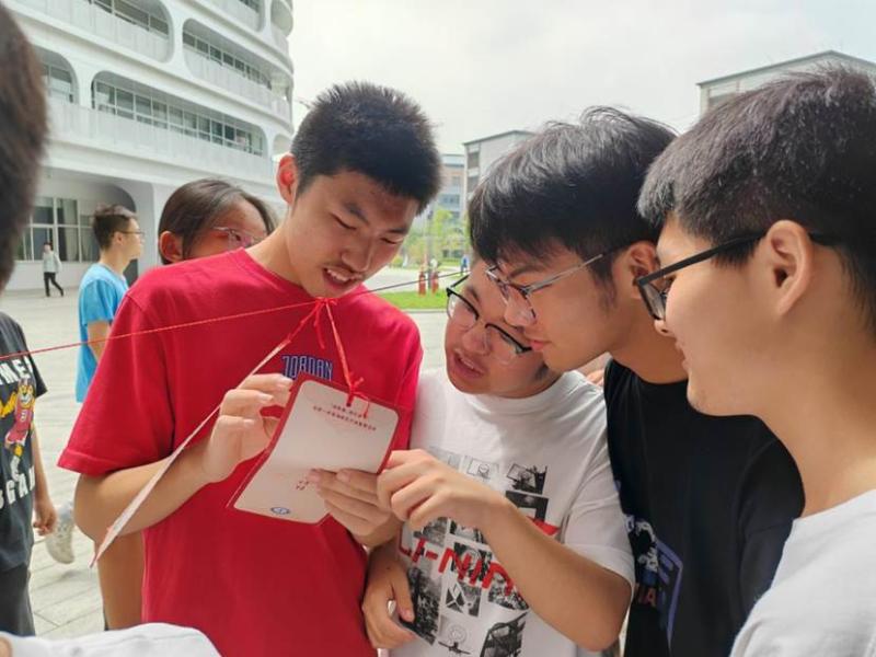 笑语解玄机,共庆团圆喜。从各种艺术作品中走出来,便能看到食堂门口挤满了人,同学们围观着挂在绳上的纸页,拿起一张,只见“一轮明月照窗前”的字样印在纸上,纸张的背面还写着“打一四字礼貌用语”几个字。这是灯谜社组织的灯谜竞猜活动。灯谜社巧设谜题,把各种中秋民俗趣意呈现在纸上,在一张张页签谜面上,引发同学们对中秋佳节的想象。