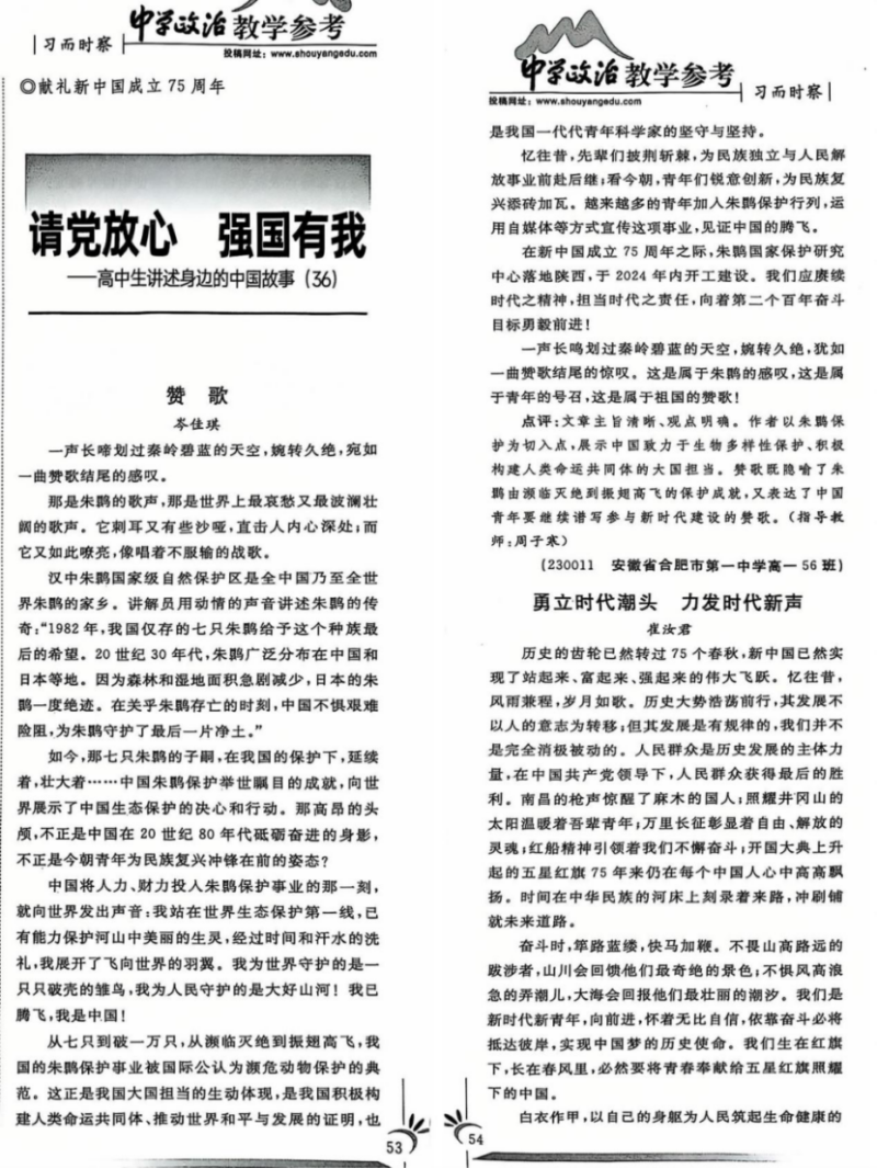为深入贯彻新时代党的教育方针,推动中学生时政素养的全面提升,全国中文核心期刊《中学政治教学参考》特设“习而时察”栏目,面向广大中学生征集优秀作品。该栏目旨在帮助学生通过讲好身边的中国故事,不断深化对先进理论的系统学习,逐步形成对中国特色社会主义的认同、自信和自觉。