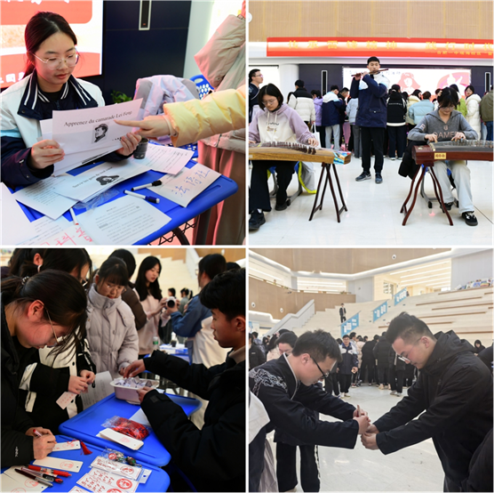 汉服社展位前古韵流淌,身着传统服饰的社员以揖礼传情,带领同学们制作雷锋主题书签。古典纹样与“赠人玫瑰,手有余香”的箴言相映成趣,传递礼仪之美与互助之魂;译趣小语种社用中英双语设计书签,将“助人为乐”翻译成多国语言,让雷锋精神跨越文化藩篱;民乐团以悠扬乐声为现场增添温情,并在演奏间隙科普笛子、古筝知识,用音乐传递公益力量。