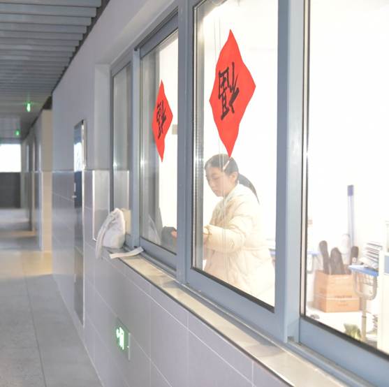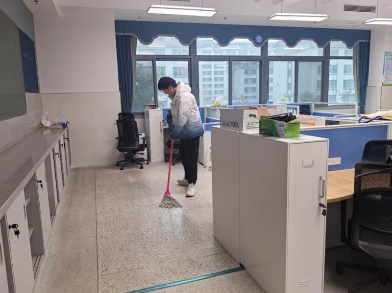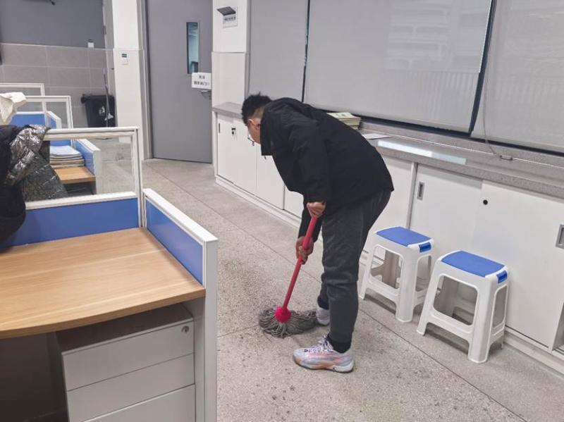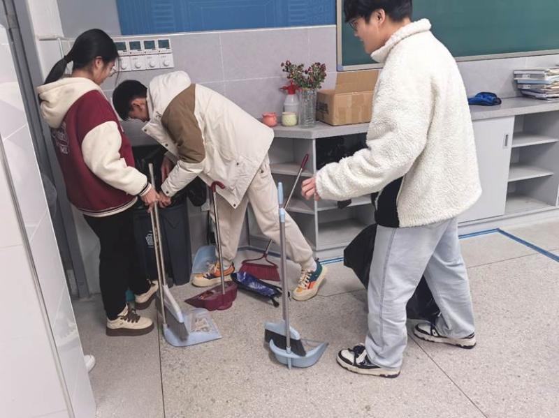教师办公室内,桌椅被逐一归位,窗台与柜顶的积尘被彻底清理,绿植的点缀让办公环境更显生机;阶梯教室中,黑板、讲台、桌椅经过细致擦拭,地面光洁如镜;公共走廊上,学生们俯身捡拾落叶、清理走廊栏杆,连隐秘角落也焕然一新。春日的阳光透过玻璃,映照出少年们忙碌的身影,汗水与欢笑交织成劳动的赞歌。