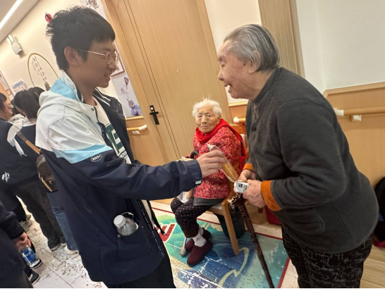 演出结束后,志愿者们分成两组:一组负责分发慰问品,将精心准备的面包和牛奶送到每位老人手中;另一组则在工作人员的带领下,前往房间探望行动不便的老人。在207房间,同学们见到了103岁高龄的张奶奶。领头的同学将慰问品轻轻地放在她的床头。老人家听力不好,说话也不多,但当同学们轻声向她问候时,她仍努力点头示意,浑浊的眼眸中闪烁着慈爱的光芒。