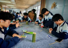 正值青年的同学们怀揣一股热情,光看看哪够呢?肯定要实地学习操作一番!工作人员带领同学们“手把手”学做纪念品——竹船。开始的时候我们简直一窍不通,可在教师们一步步的熏陶,指引下,我们的小船渐渐出现了模样,哪怕有时丑的让我们发笑,也毫不畏惧,继续学习制作。同学们互帮互助,深切感受到竹文化的同时,也学习到团结互助的重要性。