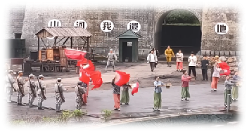 重头戏还在后面。在合一学生们感叹俗世有奇人之时,大别山新四军抗日的表演接踵而至,我们快速有序进入场地,落座后,一声巨响打破了宁静,所有人的心被提到了嗓子眼,只见舞台上空的日军飞机开动了起来,划过的地方接连炸响,这样近距离地感受日军残暴的行径,体会人民的水深火热,让我们无比痛心和震撼,刚刚还是载歌载舞的老百姓就这样横尸街头,所有人沉寂了下来,为这一刻默哀。