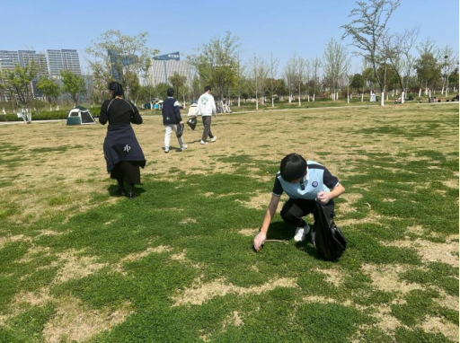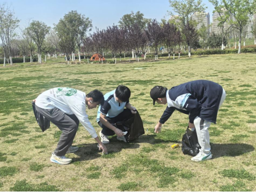 活动当日,志愿者们身着整齐校服,佩戴手套,分组携带垃圾夹和分类垃圾袋,对淝河校区周边的淝河码头生态公园、社区主干道及绿化带展开“地毯式”清理。他们仔细搜寻草丛、步道和公共设施周边的塑料瓶、烟头、纸屑等废弃物,尤其关注隐蔽角落的卫生死角。在清洁过程中,同学们还向过往市民宣传垃圾分类知识,呼吁大家共同维护公共环境。经过两小时奋战,累计清理垃圾20余袋,其中可回收物经二次分拣单独存放,体现了环保行动的规范性与科学性。