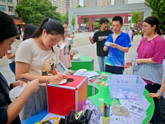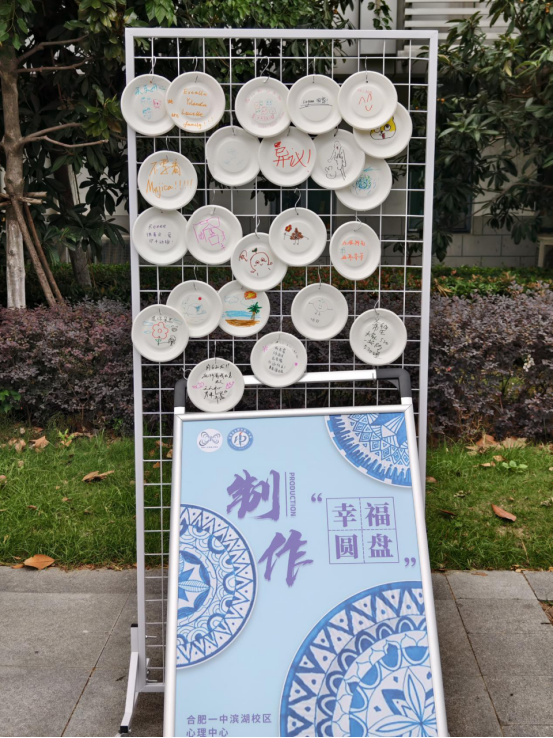 在活动现场,最受欢迎的活动是绘画幸福圆盘。同学们在在空白圆盘上画下让自己感到幸福的点滴小事,五彩缤纷的圆盘被挂在展架上,大家将自己的幸福与他人分享。这一活动让同学们回忆起日常生活中的幸福小事,承载着幸福记忆的圆盘在微风中摇曳,让大家流连忘返。
