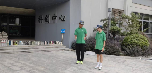 好在科创中心的空地上军训方阵如松挺立,只见一旁身姿如松的班长仲承恩同学挺步向前,手把手扶着同伴略歪的肩线,指尖轻点脚跟间距,用标准军姿在同伴面前描述出“镜面教材”。“1234。”口令重启,曾经带涩的动作已与方阵浑然一体,盛夏骄阳穿透科技中心的玻璃幕墙,洒在两位少年并肩的身影上,高一(42)班的蓝字班牌与这群意气风发的少年交相辉映,勾勒军训最动人的底色。