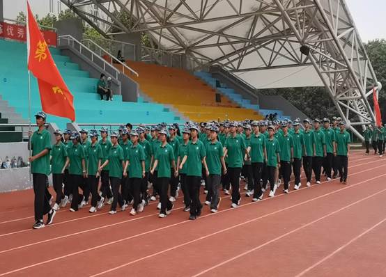 分列式开始,十四连的学子们踏着乐曲节拍稳步向前,步伐整齐得如同经过精密校准的仪器:每一步的步幅分毫不差,每一次摆臂的高度精准一致,脚掌落地时发出的 “咚咚” 声与鼓点完美重合,连呼吸的节奏都似被统一调配。他们目视前方,下颌微收,眼神里没有了初训时的青涩,只剩坚定与从容,仿佛脚下踩着的不是塑胶跑道,而是属于青春的 “荣耀战场”。