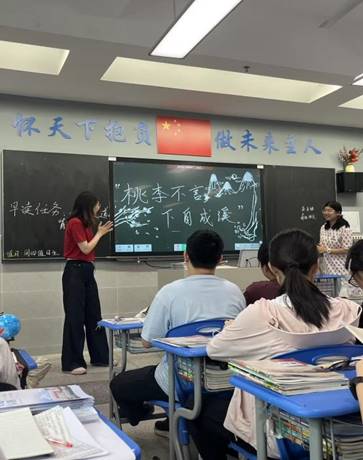 教室电子屏上,“桃李不言,下自成蹊”的字样清雅隽秀,旁衬的山水简笔,为这场活动晕染出古典雅致的氛围。晨光斜斜洒进教室,英语贾老师如往常一样手捧课本走进教室,却在看到白板的那一刻愣住,一瞬间,脸上的喜悦之情溢于言表,笑意忍不住漫上眼角,像春日里被微风吹开的蒲公英,轻盈又灿烂,仿佛熬夜备课的劳累顷刻消散。