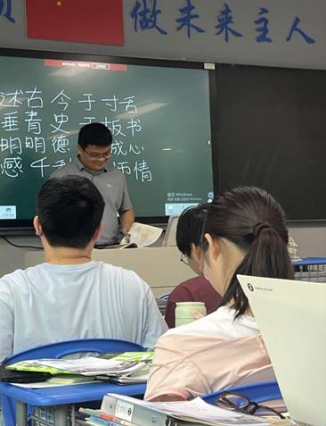 历史钟老师也融入这温情时刻,同学在白板上展示“述古今于寸舌,垂青史于板书;明明德以成心,感千秋以师情”的词句,表现出钟老师对教育的热忱传递:“愿我们在历史长河的滋养中,共同成长。”