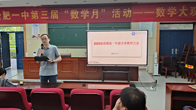 会议最后,高一年级部主任许年历对大会内容进行总结。他指出,2025级全体教师要以此次会议为起点,快速进入工作状态,将各项部署落到实处。作为“铁军”年级部,全体教师必须坚守“铁的信念、铁的意识、铁的纪律、铁的作风、铁的团结”的“五铁精神”,以坚定的教育信念扎根教学一线,以强烈的责任意识扛起育人使命,以严明的纪律保障工作高效推进,以务实的工作作风深耕教育教学,以紧密的团队协作凝聚工作合力。许年历主任强调,教育的核心是“立德树人”,全体教师要始终不忘教育初心,牢记育人使命,在新学期以更饱满的热情、更扎实的行动,关注每一位学生的成长,助力学生在知识学习与品德修养上同步提升,为合肥一中教育事业的高质量发展贡献力量。
