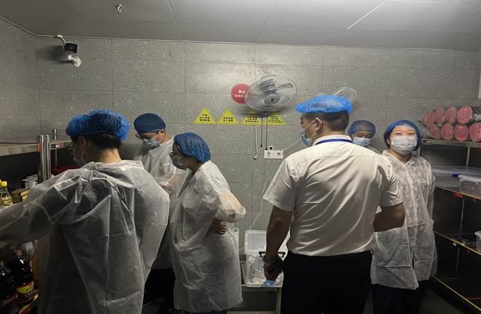 食材储存环境:查看徽王食堂冷库温度、食材分类存放情况,确保原料新鲜、无交叉污染;加工操作规范:检查徽王食堂大灶、绞肉机使用及清洗记录,优芙得食堂后灶操作流程,要求严格遵循卫生标准;餐具消毒与卫生:核查餐具消毒设备运行状态、消毒记录,以及优芙得食堂下水道清洁情况;三防措施落实:查看两家食堂防鼠、防蝇、防尘设施配置与使用情况,同时重点检查徽王食堂调料间“专人采购、专柜存放、专用台帐”管理是否到位,确保食品添加剂使用规范。