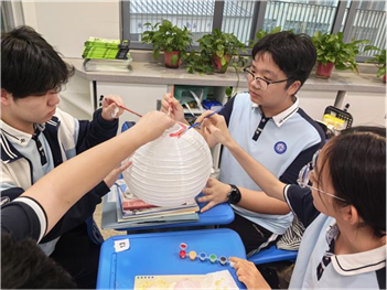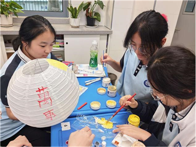 框架搭好后,大家拿起手中的画笔,绘制上明月,桂树等图案,有的还在灯笼上写下“祝祖国繁荣昌盛”“海上生明月,天涯共此时”等真挚祝福语。经过一番忙碌,一盏盏色彩斑斓、寓意吉祥的灯笼终于完成。当蜡烛点亮,温暖的光芒透过纸灯洒出,映照着同学们灿烂的笑脸,也照亮了心中对祖国的美好祝愿。